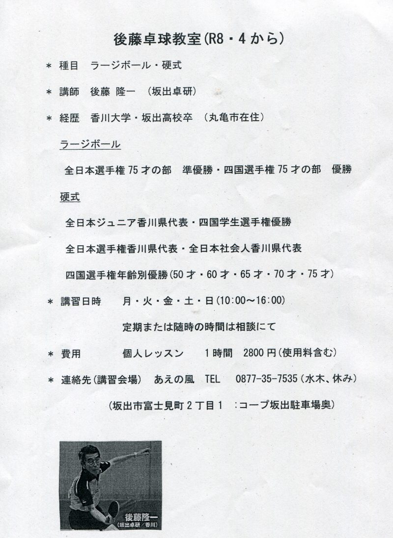 坂出卓研・ES高松所属 後藤隆一先生の卓球教室が始まります。